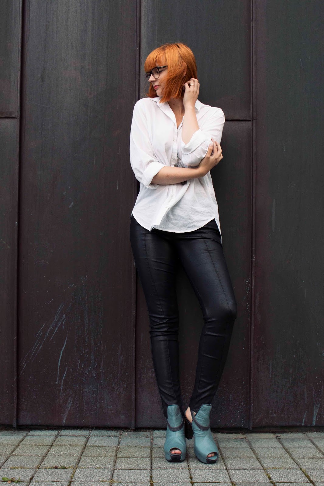 Minulla luottoasuna toimii mustat housut sekä valkoinen boyfriend-kauluspaita. Siis aivan peruskauraa ja todellakin jokaisella pitäisi olla nämä vaatekappaleet vaatekaapissa. Tyylissä käytän usein nahkahousuja, jotka ostin sovittamatta kirpputorilta noin vuosi sitten viidellä eurolla. Valehtelematta paras kirppislöyty ikinä! Näitä housuja olen käyttänyt jo enemmän kuin perusfarkkuja. Nahka tuo sopivasti särmää ja rokkihenkisyyttä asuun ja sillä saa myös tekstuuria ja mielenkiintoa kokomustiin asuihin. Lisäksi kiillon ja leikkauksen ansiosta jalat näyttää mega pitkiltä. Valkoinen paita on klassikko, mutta löysempi malli on astetta rennompi ja väljyytensä ansiosta mukava kesäisinkin (tai kun syö vähän liian ison annoksen pastaa lounaaksi).